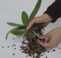 Retirez l'orchidée de son ancien pot, pour faciliter cette opération sans abîmer votre plante, laissez tremper le pot une heure dans de l'eau.